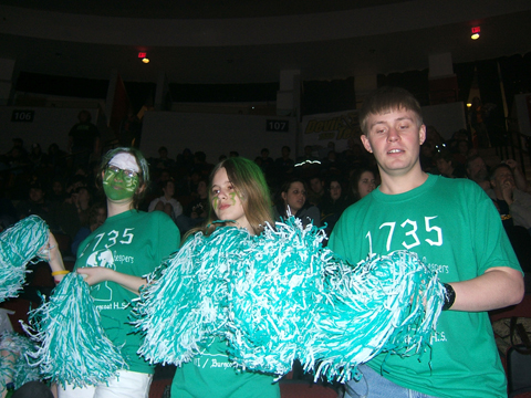 After much discussion about whether or not to have our robot go fast and score points by racing around the track, or to have it hurdle the trackballs, the team finally came up with a “compromise” robot. It was designed to be a very fast robot, but have the ability to herd and lift the balls up to score at the end of a match. The robot base was custom designed to fit our needs. It had six wheels, with the middle two offset a little, to make turning easier. The axle that the arm was on is a double axle, meaning that there were two axles, one going through the middle of the other. The outer axle rotated the manipulator at the bottom, therough capstons and cables. The inner one raised the whole arm. The manipulator made use of a four-bar linkage allowing the wrist to stay parallel to the ground no matter how far up or down the whole arm moved. That way, the trackball wouldn’t fall off while the robot was placing it on the overpass. The claw was not mechanised, the robot would scoop the ball up and the claw would cup it.