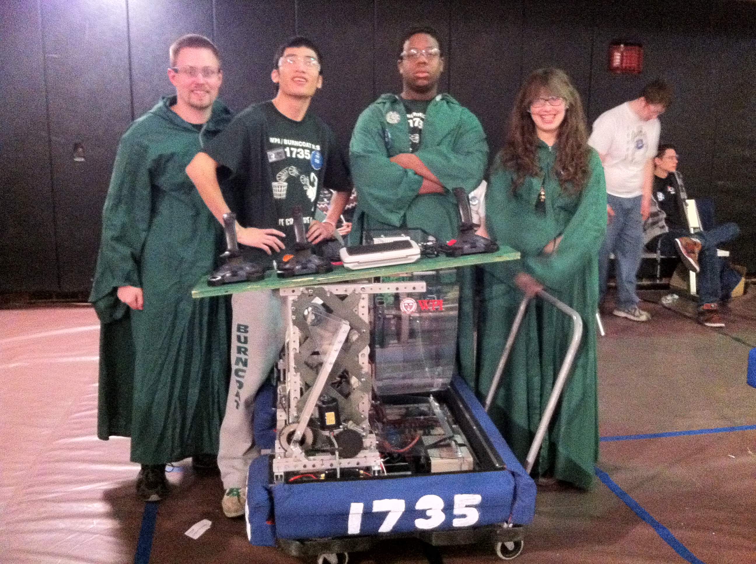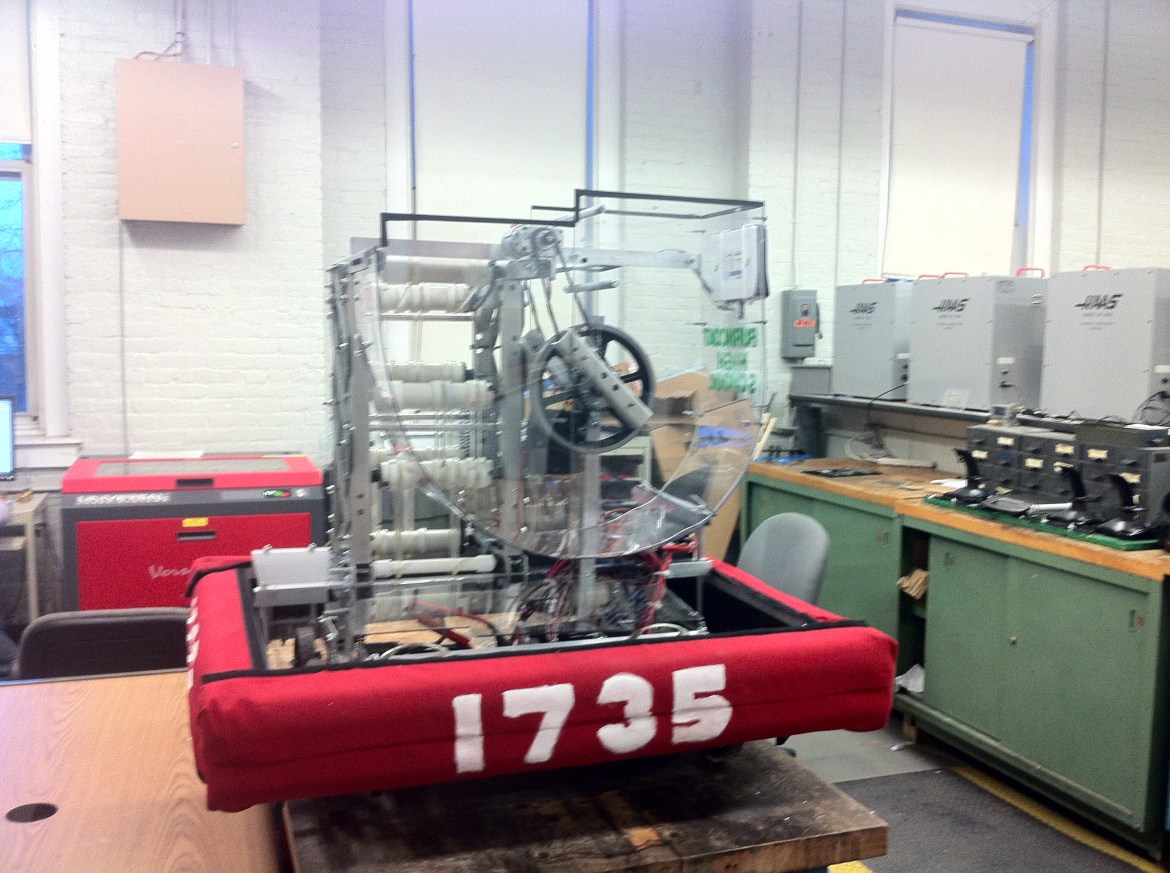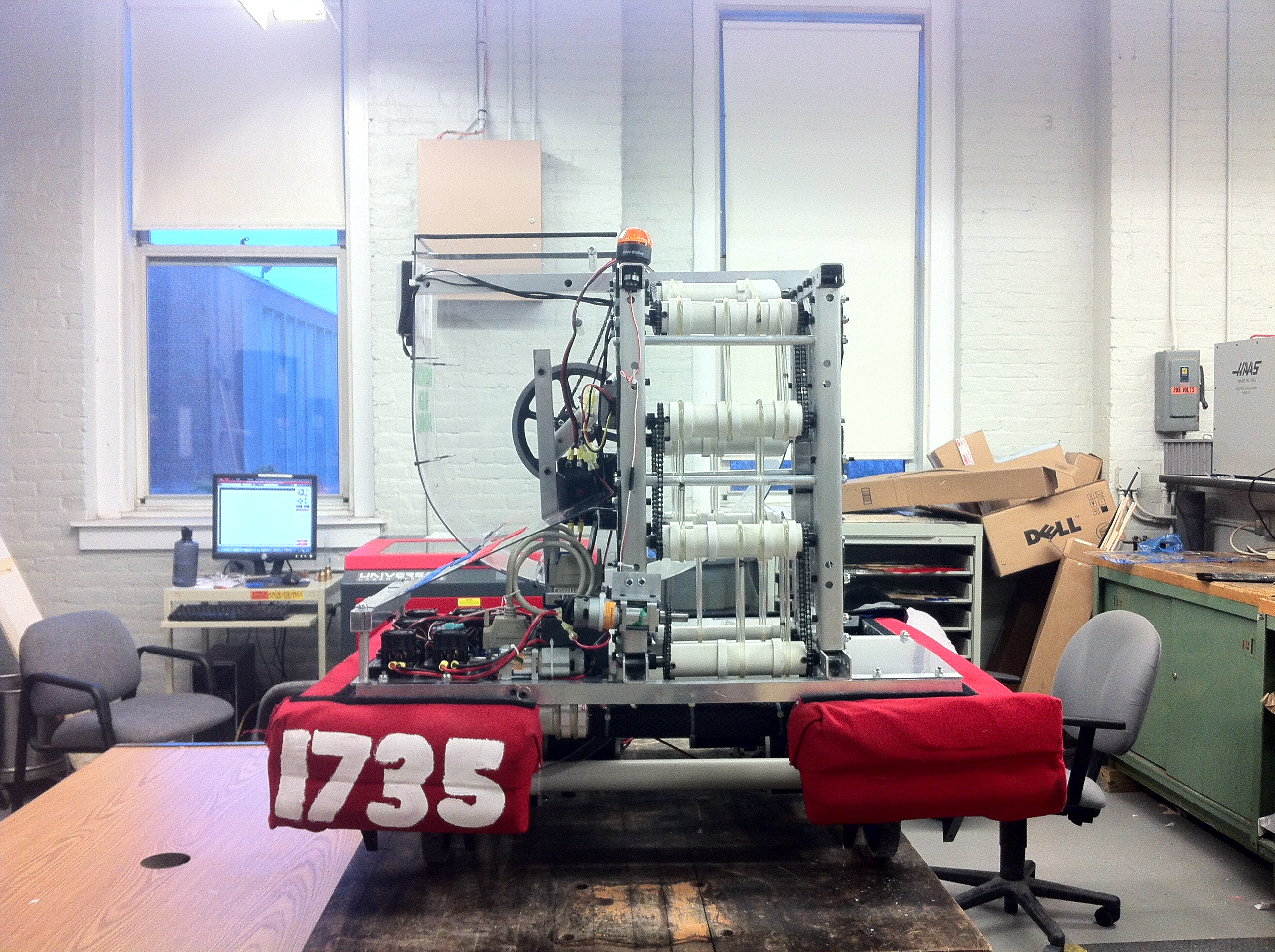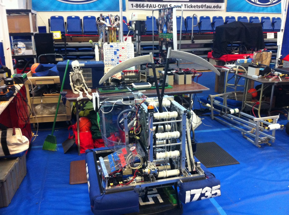 Rebound Rumble is a game played on a 54′ x 27′ field. Two alliances of three teams compete against each other to score the most amount of points by shooting foam basketballs into hoops. At the end of the match robots would balance on bridges in the middle of the field to gain additional points. Balancing on the middle middle bridge, call the Coopertition Bridge, with the opposing alliance resulted in an additional win for both teams.